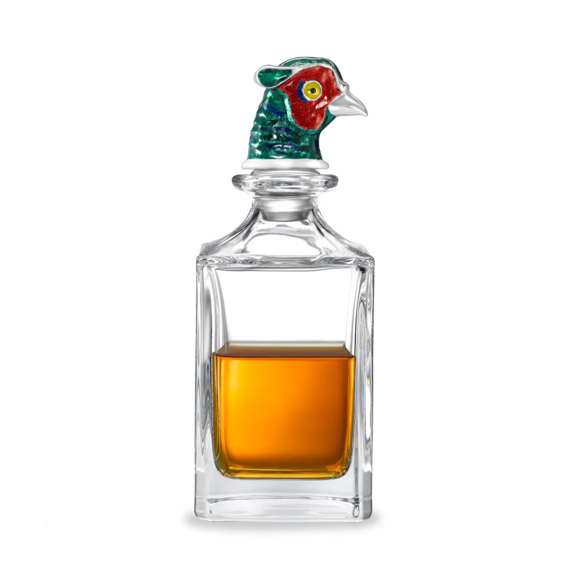 Our beautiful crystal glass decanters are extra special. Manufactured in a traditional square spirit style by Dartington. Once the decanters are delivered to Deakin & Francis, we pair with one of our stunning stoppers which are designed in our factory, in Birmingham s historic Jewellery Quarter. This pheasant decanter holds 65cl.This whisky decanter is finished with a stunning, metal plated pheasant head stopper, designed and manufactured by Deakin & Francis. Hand-enamelled in a deep green and red pattern with silver beak, this pheasant decanter is sure to be the centre of attention at any party or get together.