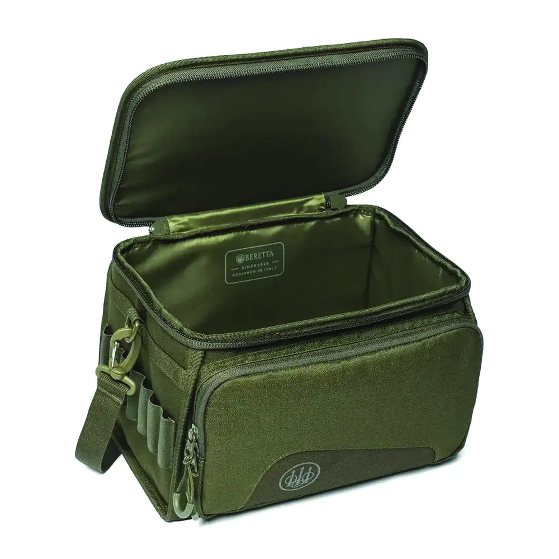 The Beretta Gamekeeper Evo Cartridge Bag 250 is a large cartridge bag holding up to 10 boxes x 25 cartridges with 3 outside pockets for chokes, caps and other accessories. The Gamekeeper EVO Accessories line offers a wide range of products aimed at satisfying hunters’ array of needs. The combination of lightweight technical materials (scratch-resistant and waterproof polyester), functional details and ergonomic shapes guarantee maximum protection for your weapon.