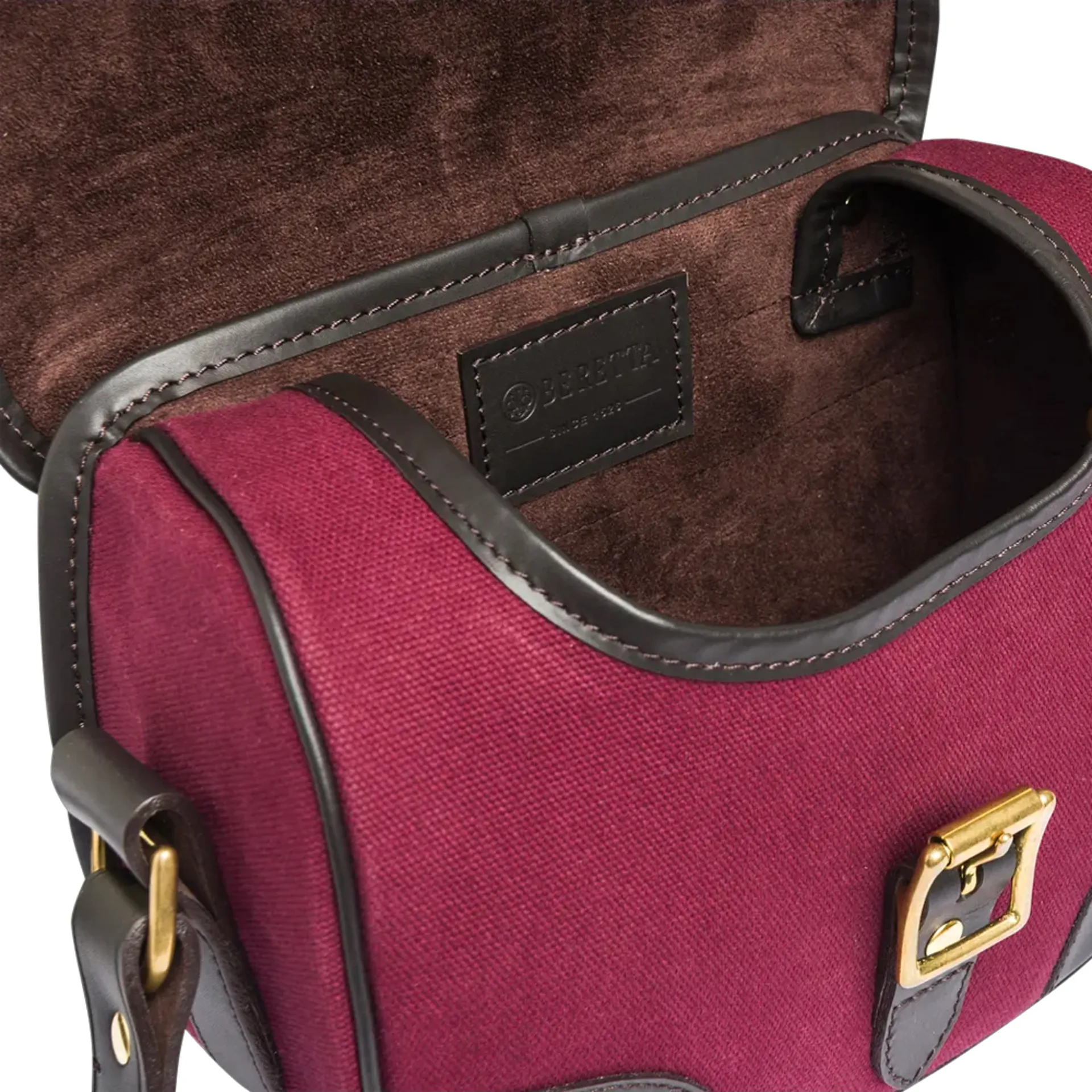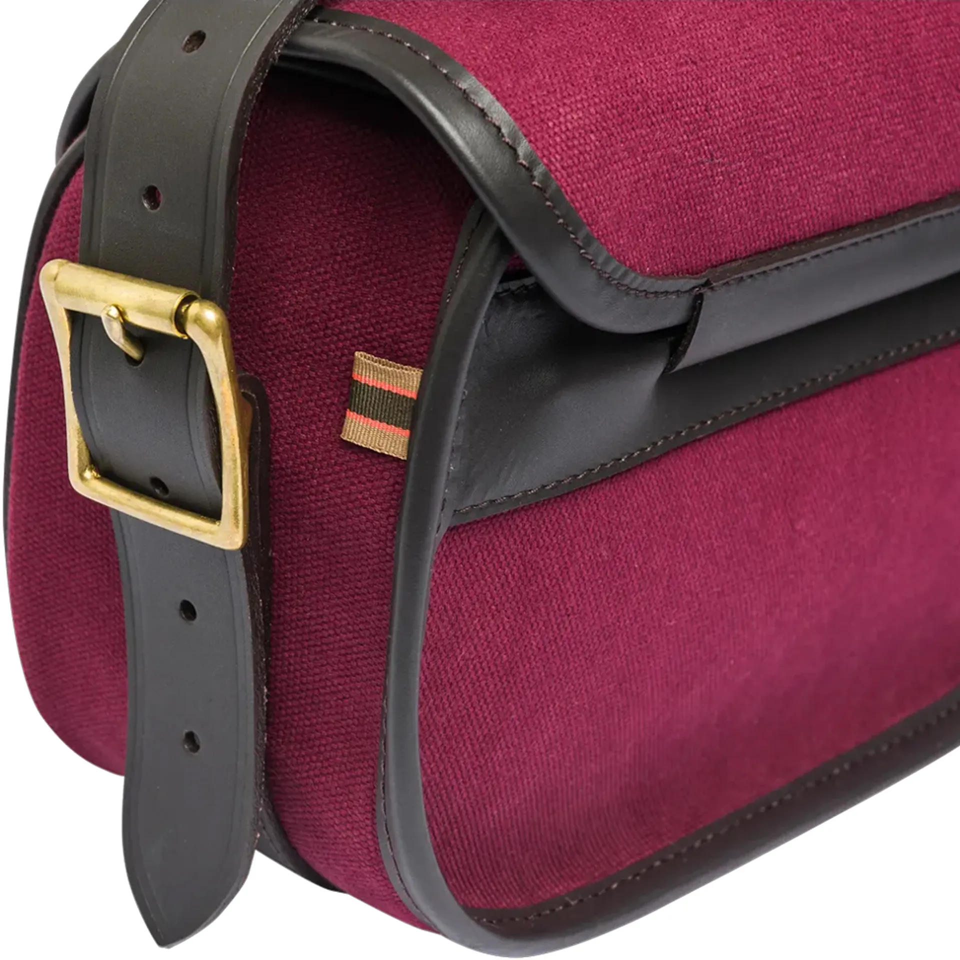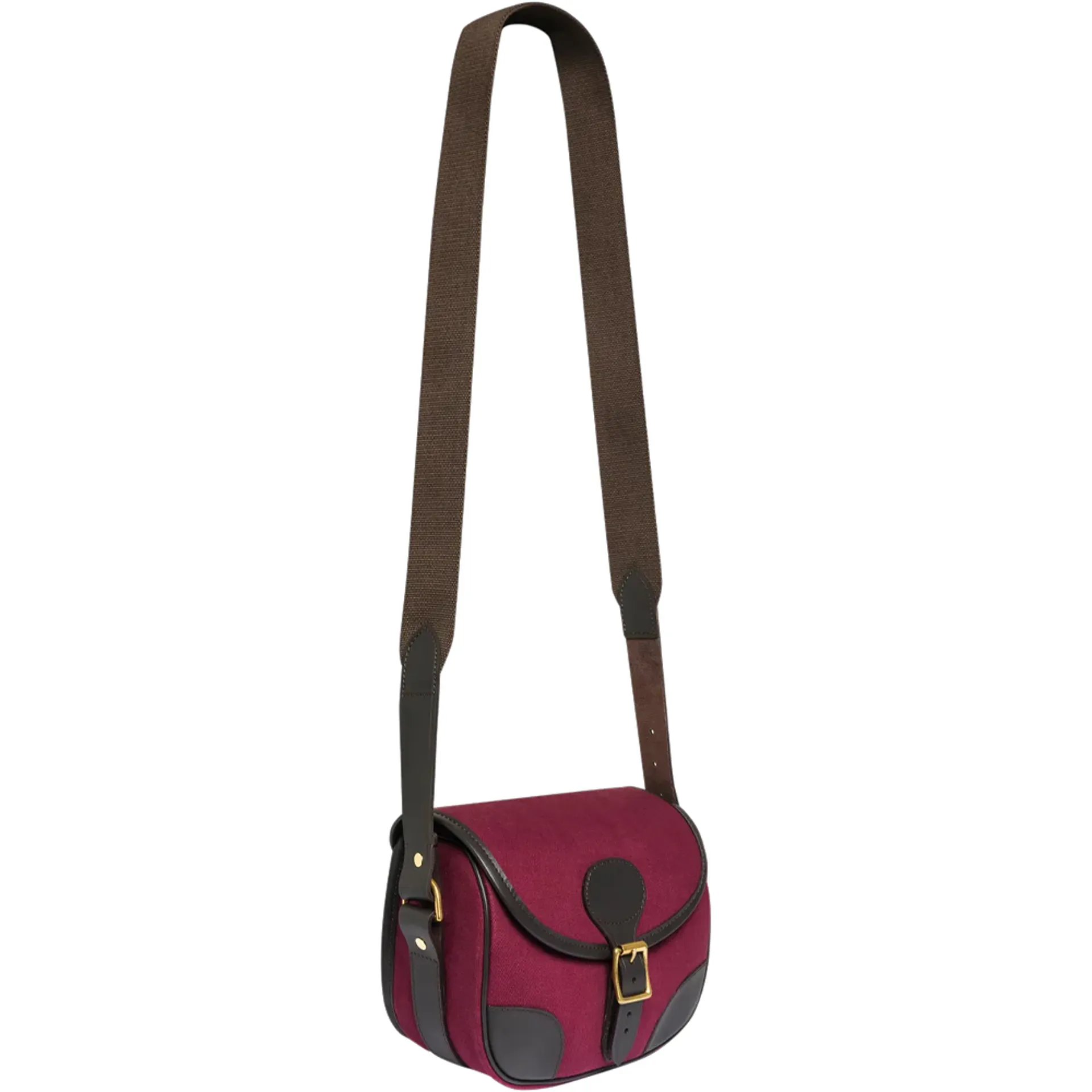 Cartridge bag made of cotton canvas and genuine leather panels with flap closure. Brass accessories, buckles and rivets. It can hold up to 100 12-gauge cartridges.